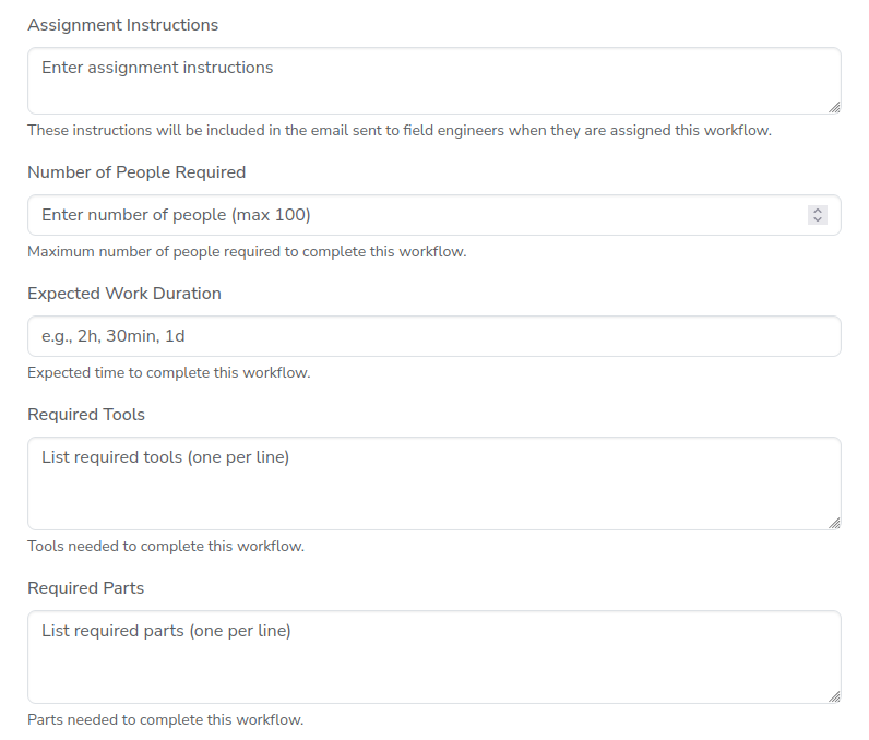How it's used: - Shown to field engineers before starting the workflow - Used in work duration reports for context (e.g., 2 people × 30 min = 60 total person-minutes) - Helps with resource planning